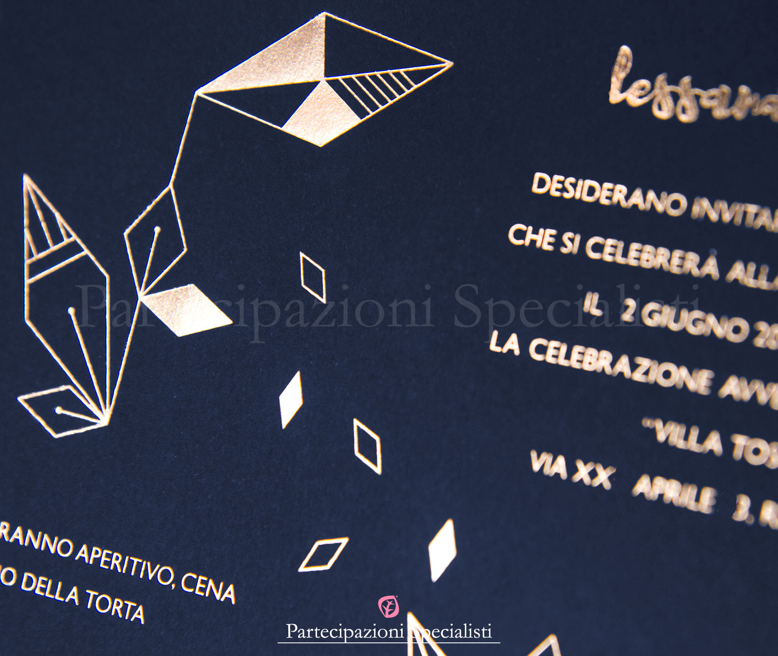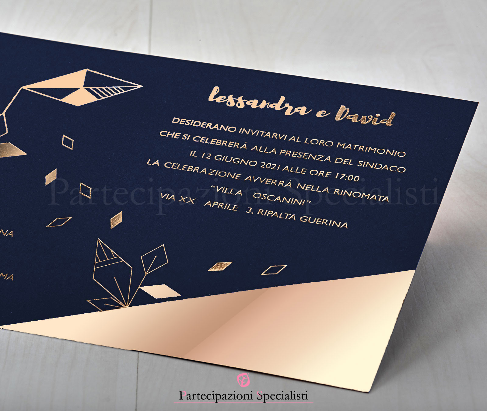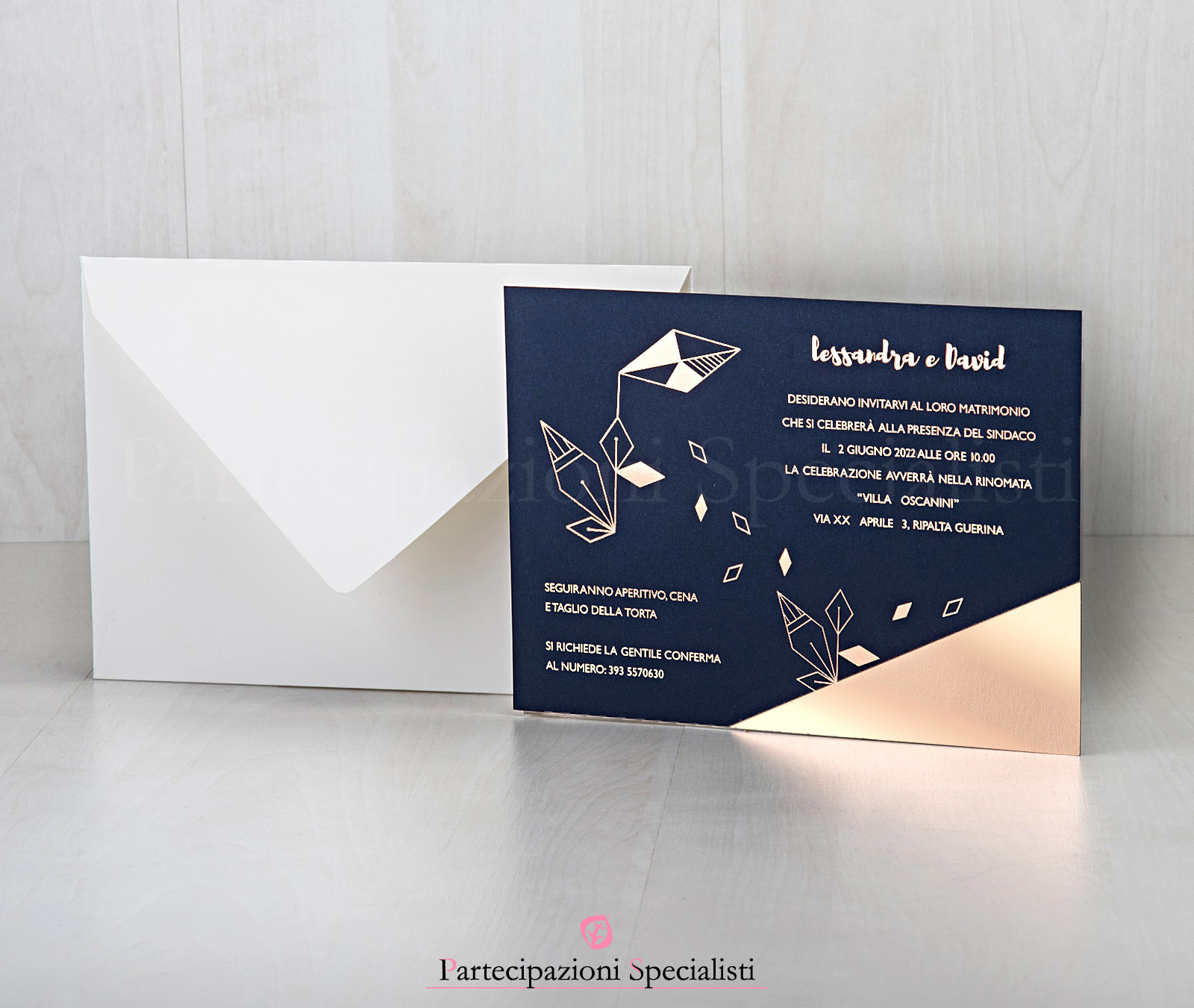 Inviti matrimonio eleganti su cartoncino blu di Prussia scuro. Impressione a caldo in lamina oro rosa, o rame rosa. Buste bianche pregiate a buccia d’arancia. Dimensioni annuncio 17,5x12,5cm. Possibilità di stampare a parte invito ristorante. È possibile formato a libretto, quattro facciate. Tutta la grafica personalizzata compresa nel prezzo. A scelta lamina oro rosa, od oro normale, o altri foil di metalli preziosi.